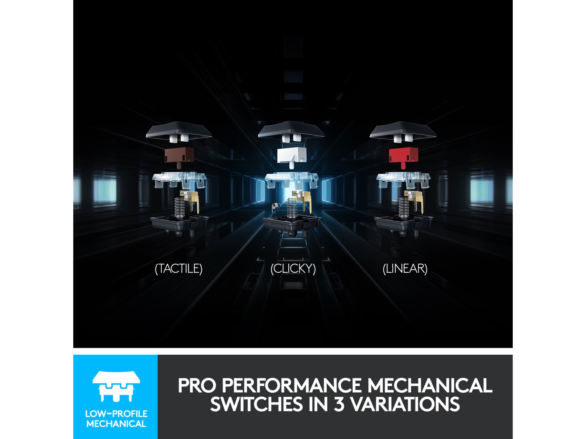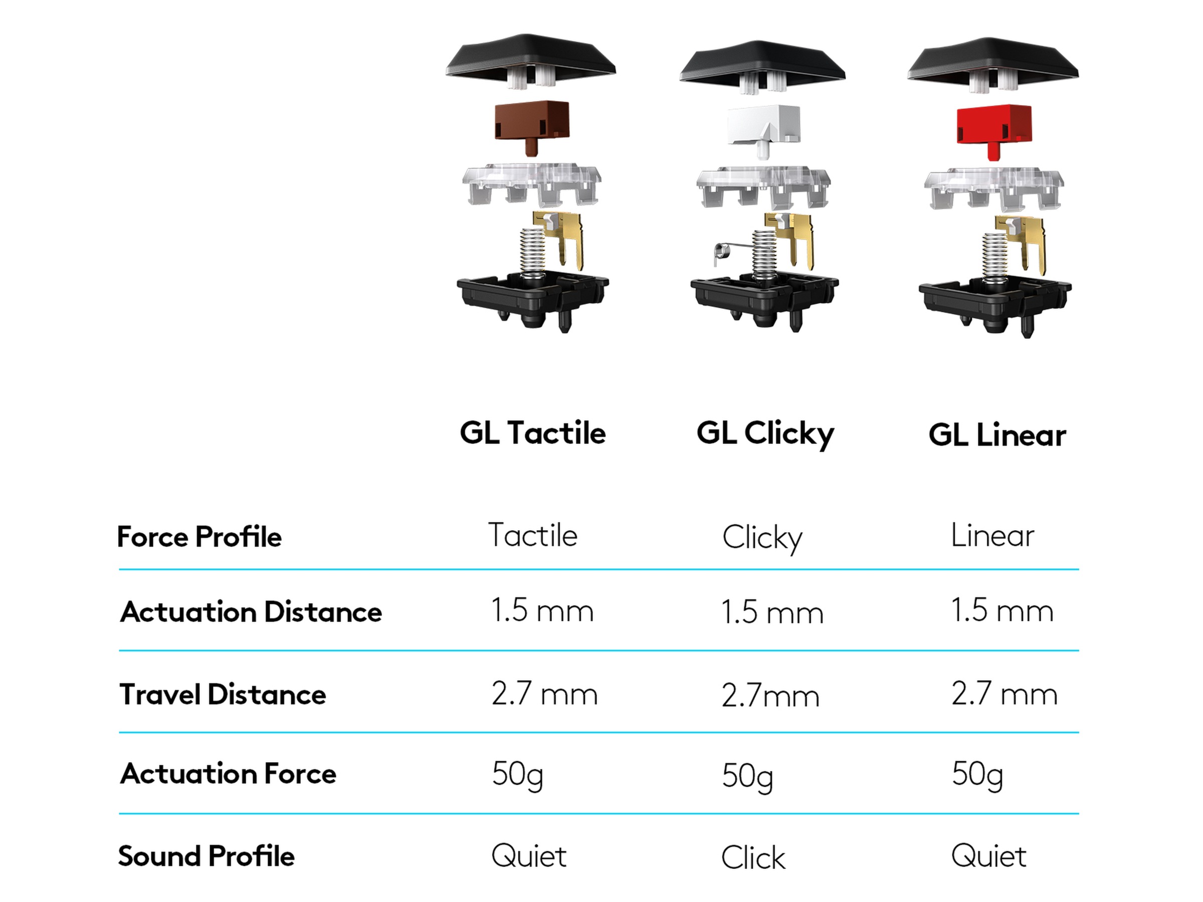 Nya, högpresterande spelbrytare ger samma fart, exakthet och prestanda som mekaniska brytare vid halva höjden. GL Tactile-brytaren har en märkbar höjning vid aktiveringspunkten. Finns i tre alternativ: GL Tactile, GL Linear eller GL Clicky.