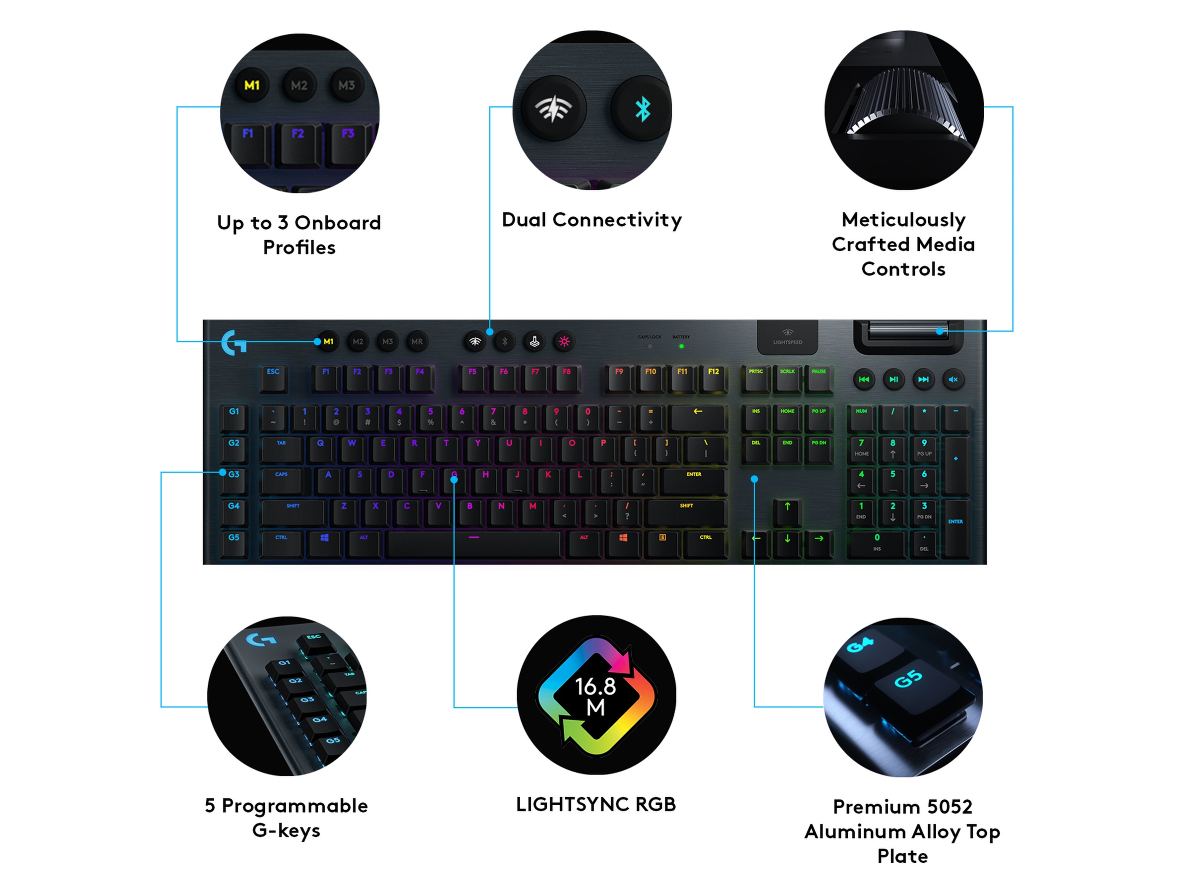 Nästa generations RGB-belysning synkroniserar belysningen med ditt spel- och underhållningsinnehåll. Anpassa varje knapp eller skapa anpassade animationer från ~16,8 miljoner färger med Logitech G HUB-programvaran.