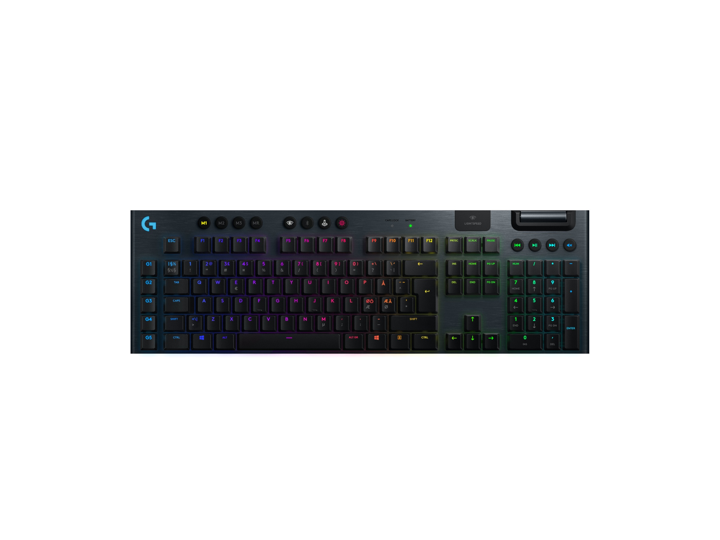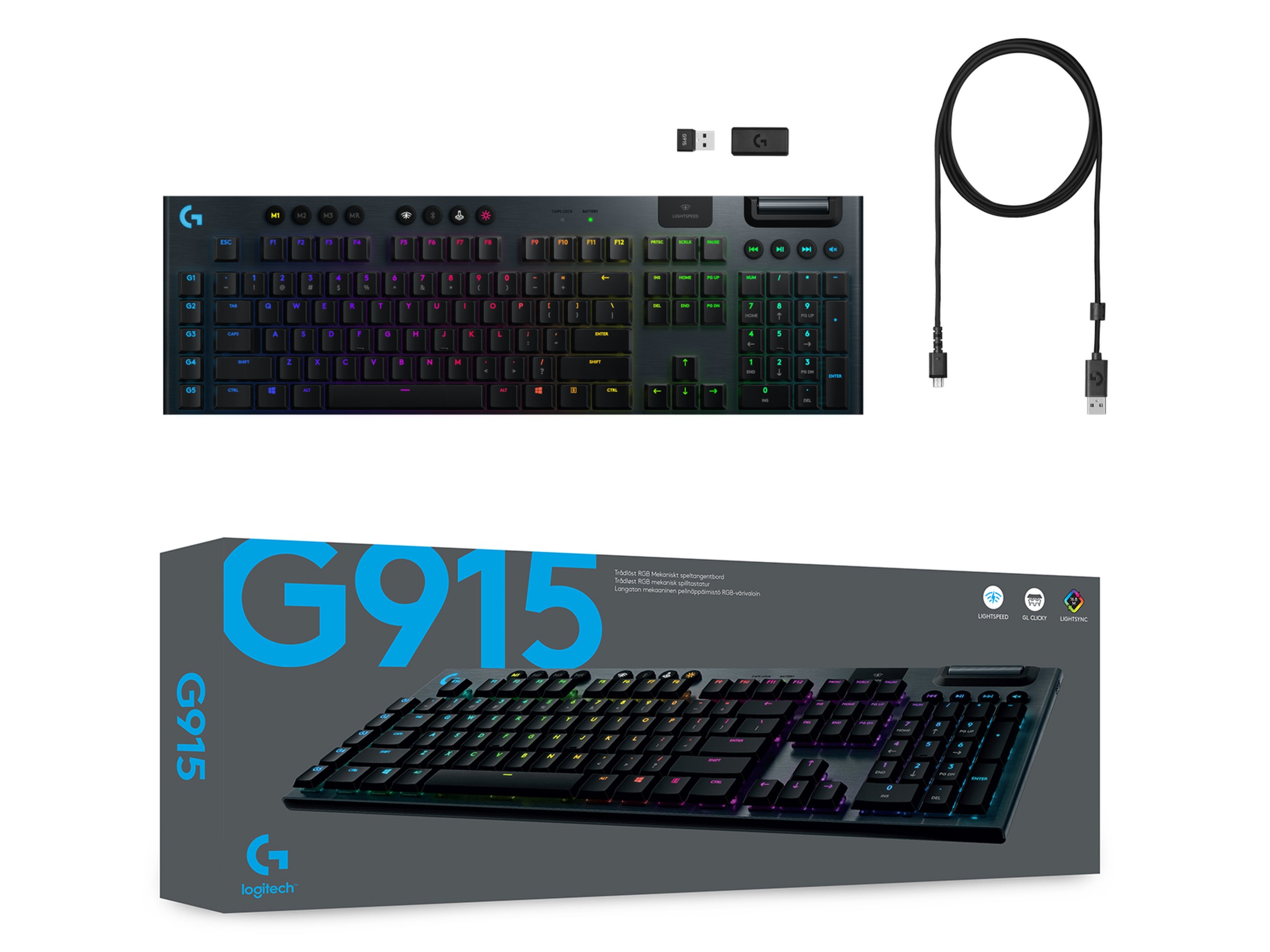 G915 är en ny kategori av trådlösa mekaniska speltangentbord med tre val av diskreta GL-brytare och 1 ms trådlös LIGHTSPEED i proffsklass. Levererar 30 timmars oavbrutet spelande på en fulladdning.* Helt anpassningsbar och avancerad LIGHTSYNC RGB-teknik för varje tangent för att synkronisera belysningen till innehållet.