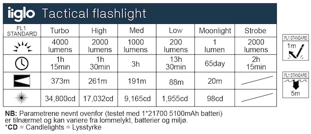 Iiglo Ficklampan 4000 LM har ett väldigt kraftigt metall hölje och kan uthärda fall från en höjd på 1 meter. Den är också vatten motstående och kan skänkas ner upp till 5 meters under vatten. Ficklampans lätt-att-ta tag I yta och en händig storlek gör den lätt att använda vid alla tillfällen.