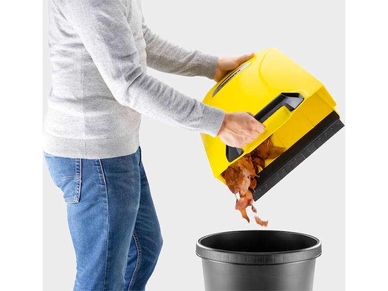 Maskinen transporterar smuts direkt in i en 20-liters smutsuppsamlare. De långa borstarna på sidoborsten säkerställer en noggrann rengöring ända intill kanten. Det oändligt justerbara tryckhandtaget kan ställas in efter användarens höjd. Om det behövs kan sopmaskinen fällas ihop utan att du behöver böja dig ner, med hjälp av fotplattan på ramen. Sopmaskinen är snabbt redo att användas. Smutsuppsamlaren är lätt att ta bort och kan läggas ner och tömmas utan att komma i kontakt med smutsen.