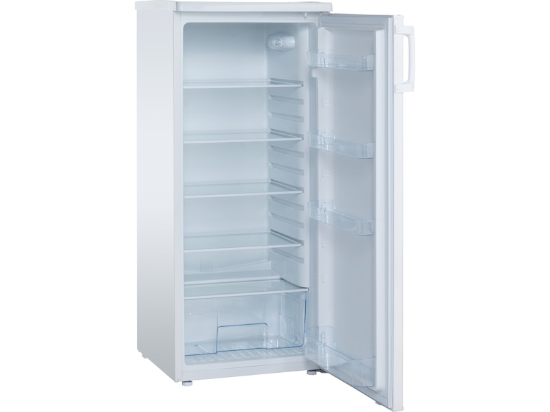 Vitt kylskåp i energiklass A++ med 197 liters utrymme, innehåller 5 hyllor och en stor grönsakslåda.
