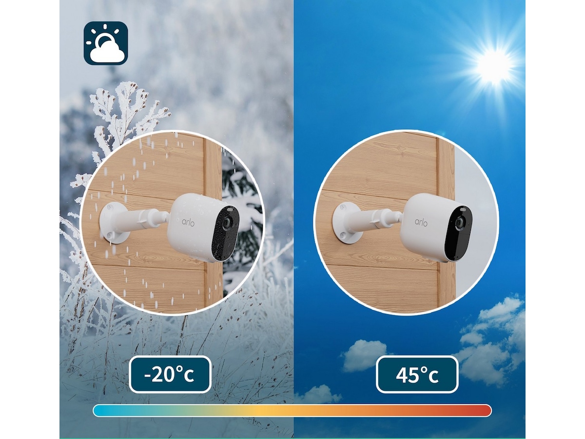 Regn-, sol-, vind- och snösäker. Vårt superstarka hölje i polykarbonat - samma material som används i skottsäkert glas - innebär att din kamera kan fungera i temperaturer från -20°C till 45°C.