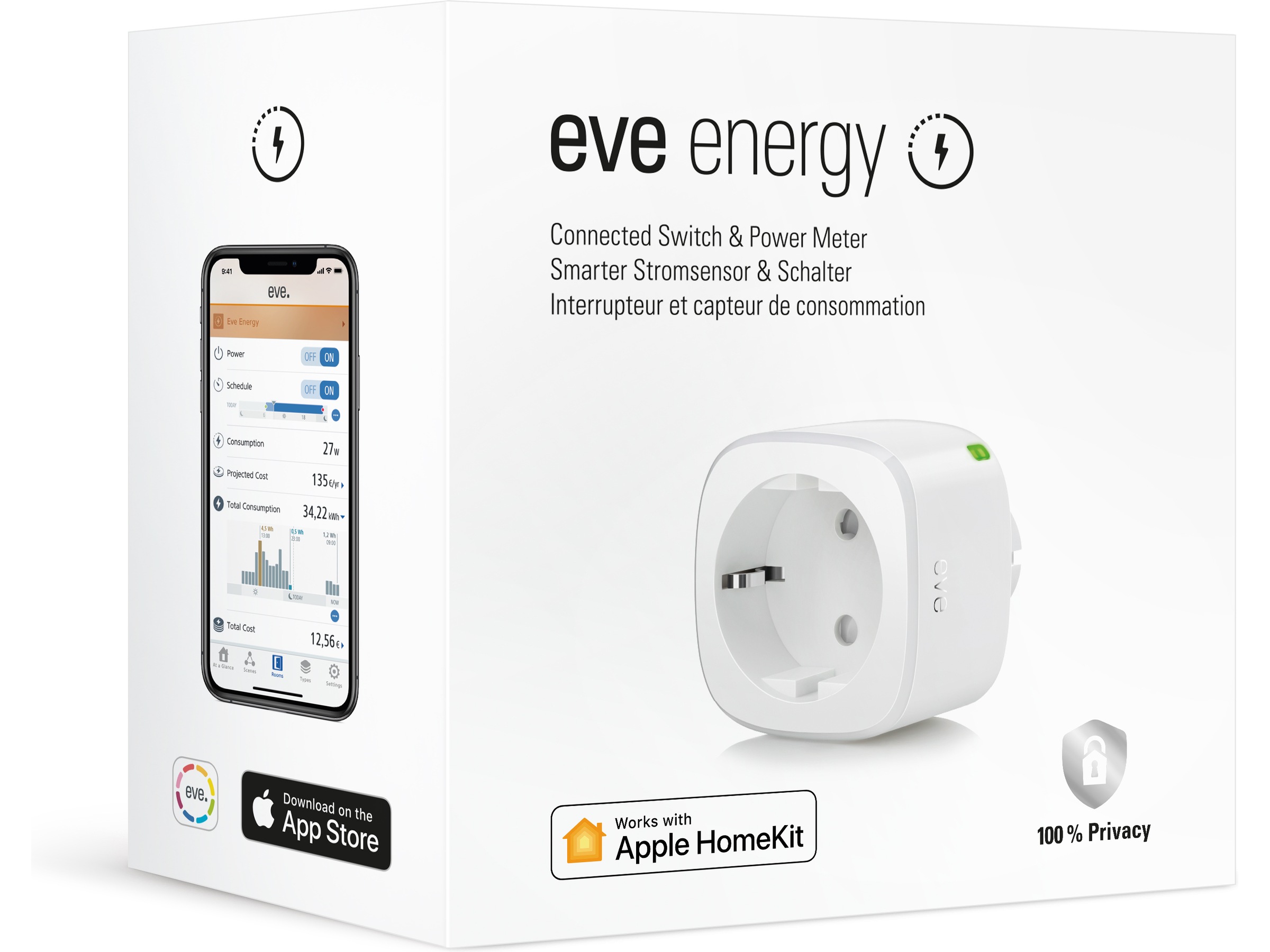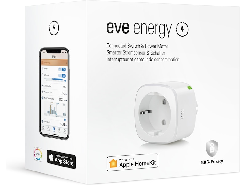 Med Apple HomeKit-teknik och TÜV-certifiering erbjuder Eve Energy enastående användarvänlighet och avancerad säkerhet, är snabb och enkel att installera och behöver ingen brygga. Och det bästa med alla Eve-tillbehör är hur de skyddar din integritet: Eve sparar inte dina personuppgifter och det finns inget Eve-moln, så dina uppgifter kommer inte att försvinna eller göras tillgängliga för tredje part.
