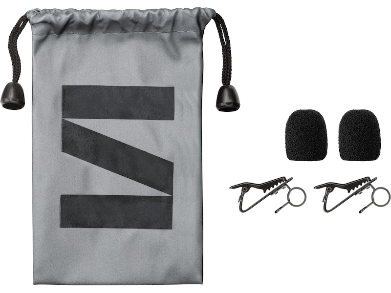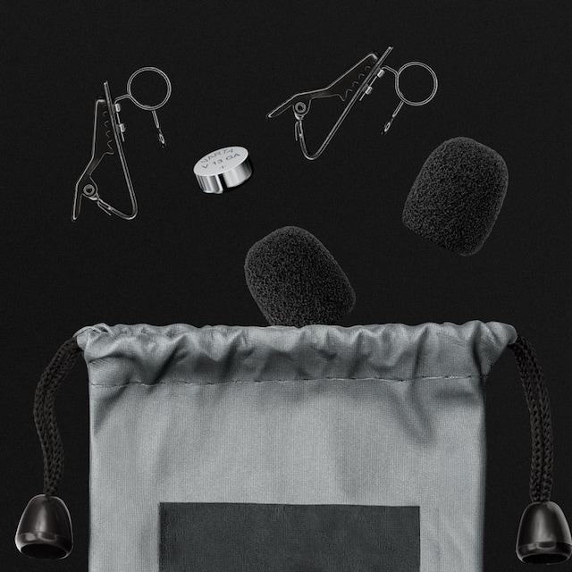 - 2 metallklämmor : gör att du kan fästa mikrofonerna ordentligt på dina kläder,