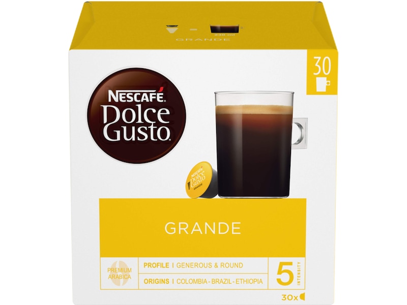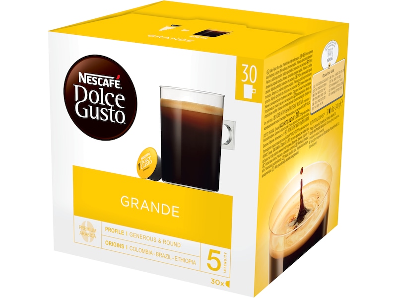 Prova NESCAFÉ® Dolce Gusto® Grande, ett 100 % Arabica-kaffe med en intensitet på 5 av 11. Kaffet serveras i en stor mugg på 200 ml och är milt med fruktiga toner, rund kropp och en fin crema.