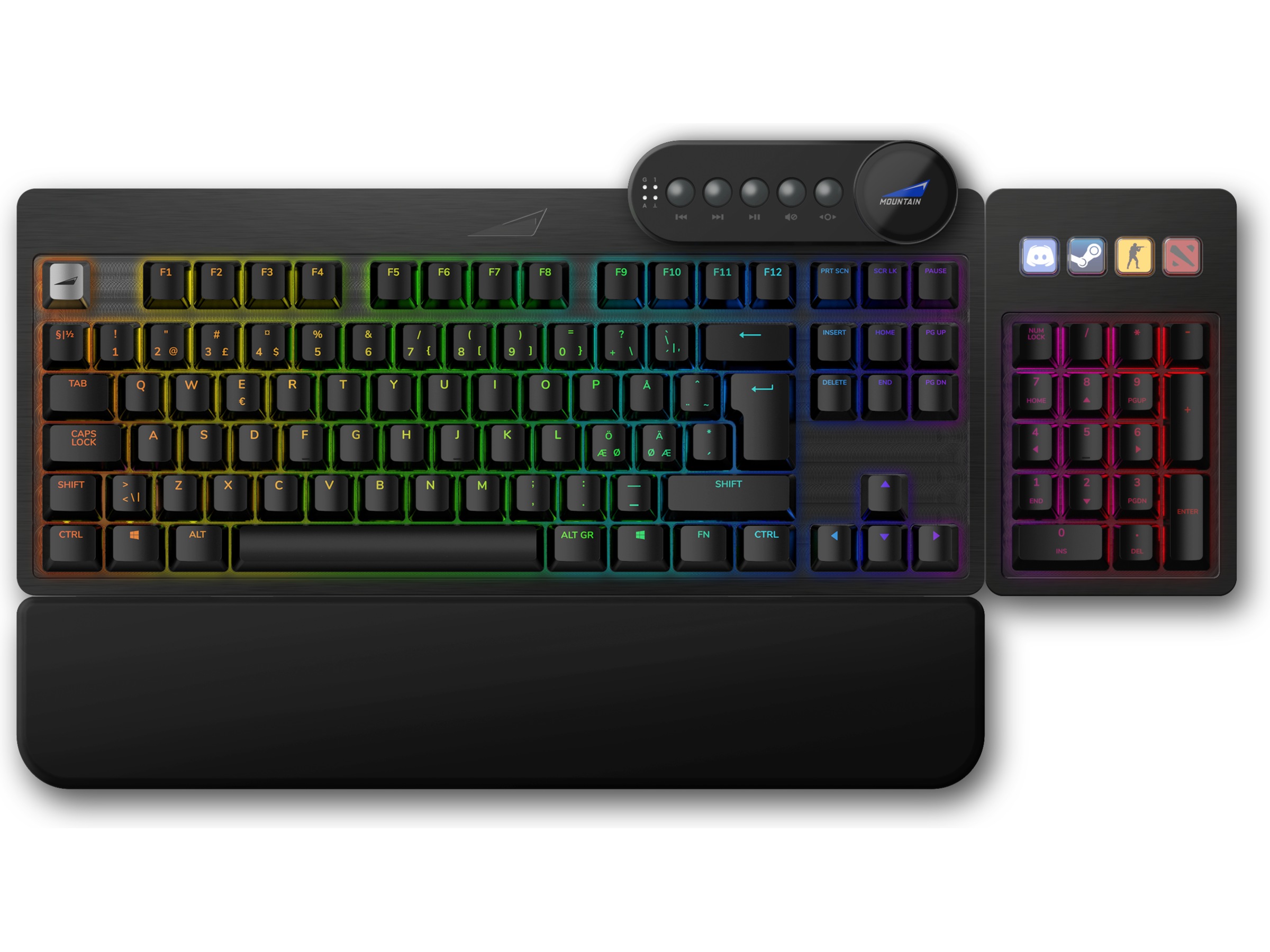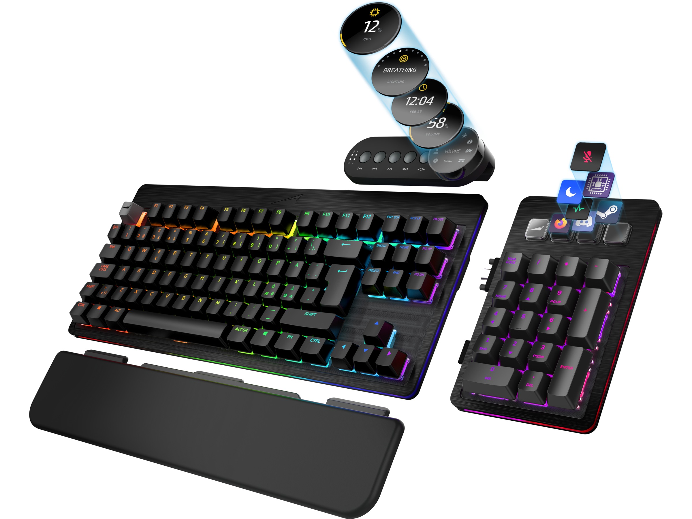 Ett hel bergskedja med kontroller och information ovanpå tangentbordet. Dessutom den första i sitt slag med en skärm! Bortsett från lättåtkomliga mediekontroller, kommer skärmen att göra det möjligt för dig att övervaka ditt system, visa eller byta profil.
