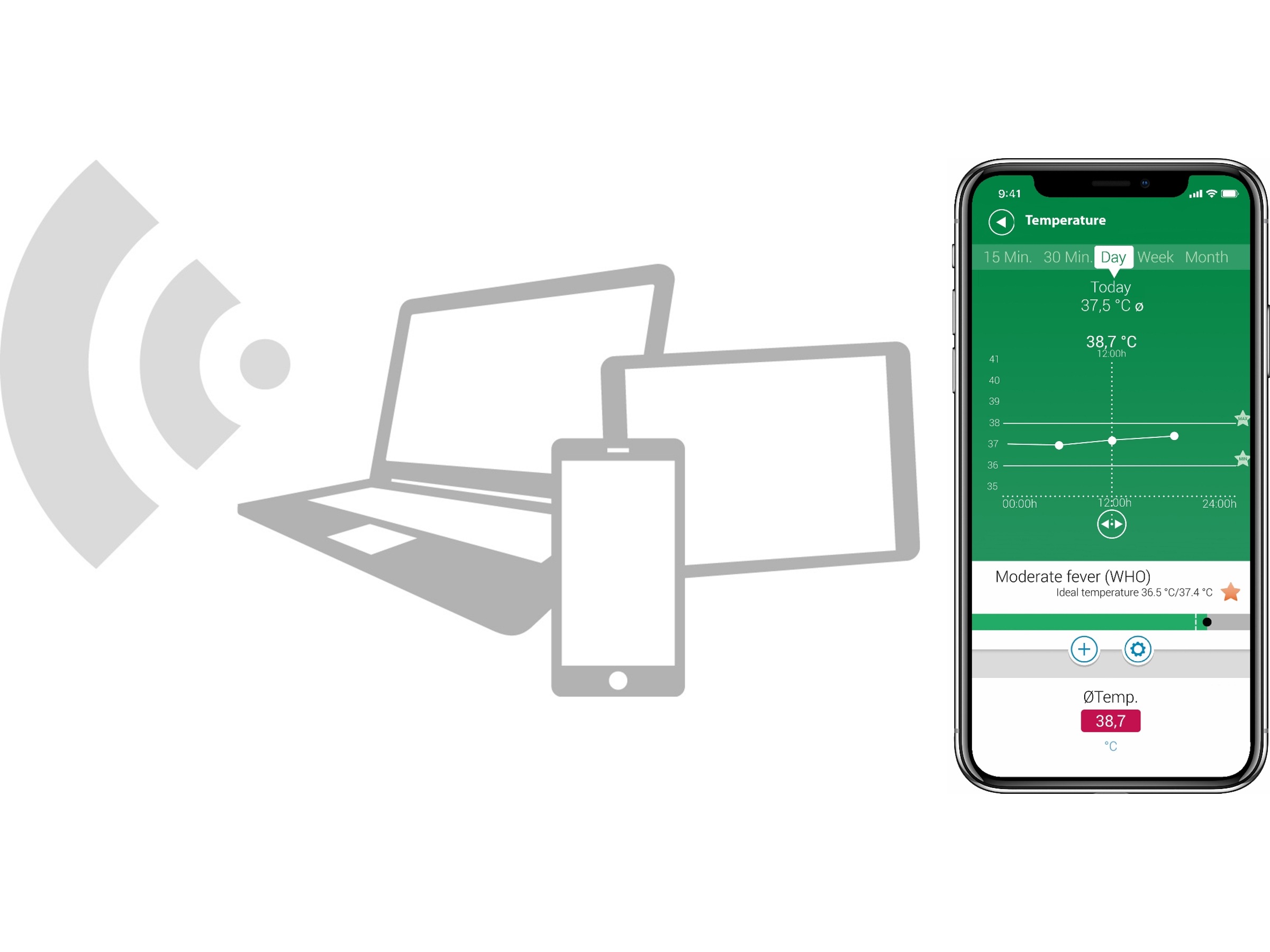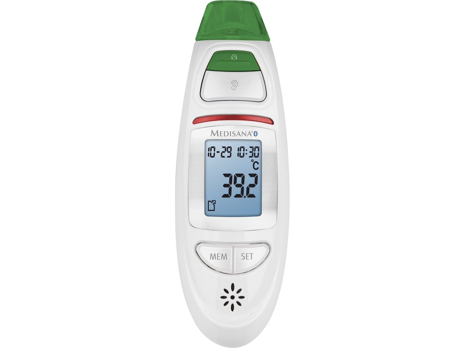 - Visuellt feberlarm med färgbyte – grön: normal temperatur, röd: förhöjd temperatur