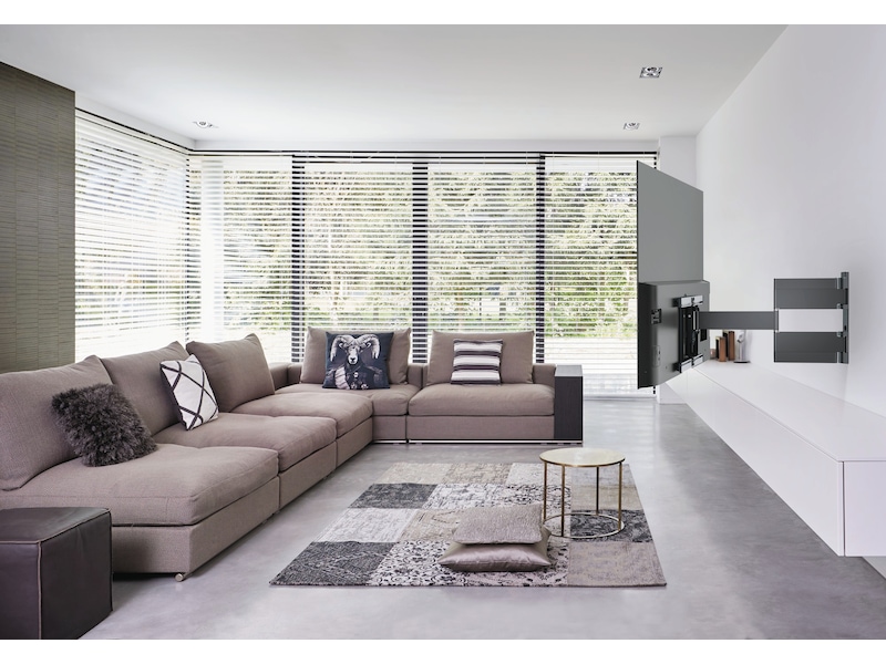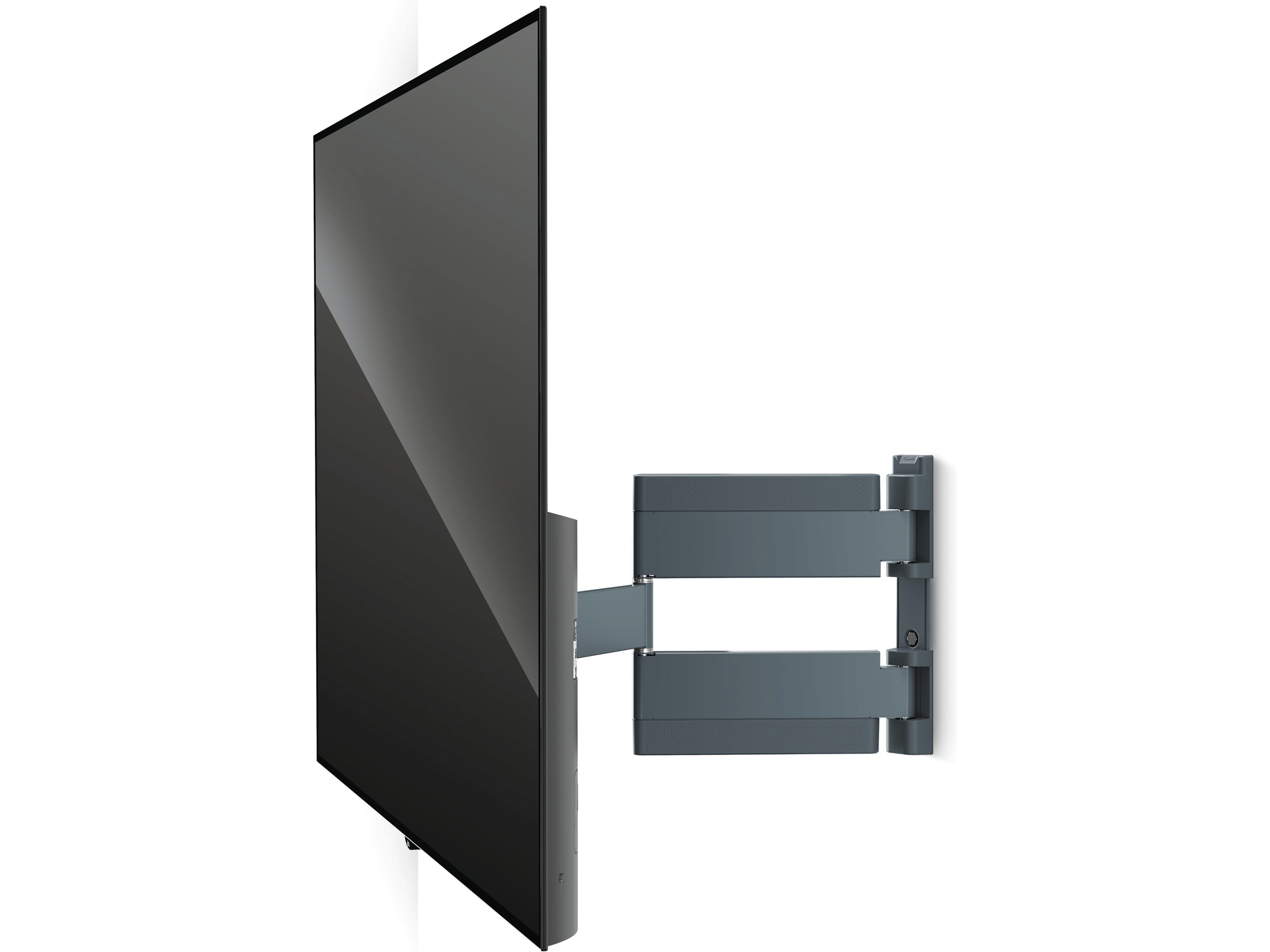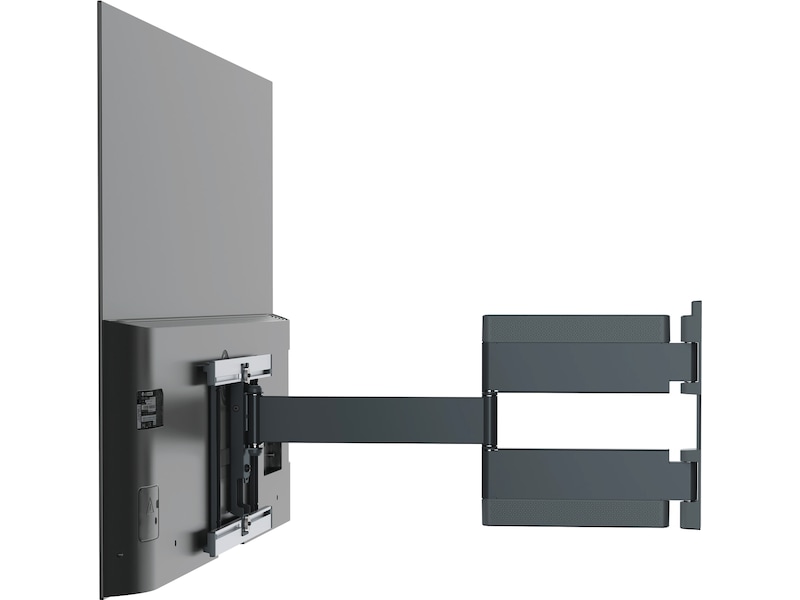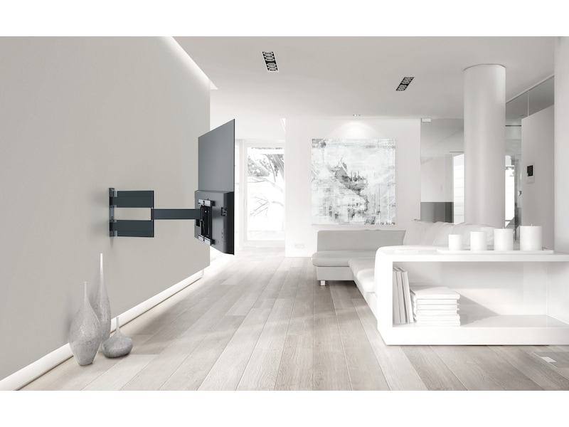 Det fullt rörliga THIN-väggfästet erbjuder också mycket flexibla svängmöjligheter, tack vare de mycket långa armarna, som rör sig smidigt och elegant. Du använder det fullt rörliga THIN intuitivt och genom det smidiga gångjärnet reagerar TV-väggfästet enkelt på dina korrigeringar.