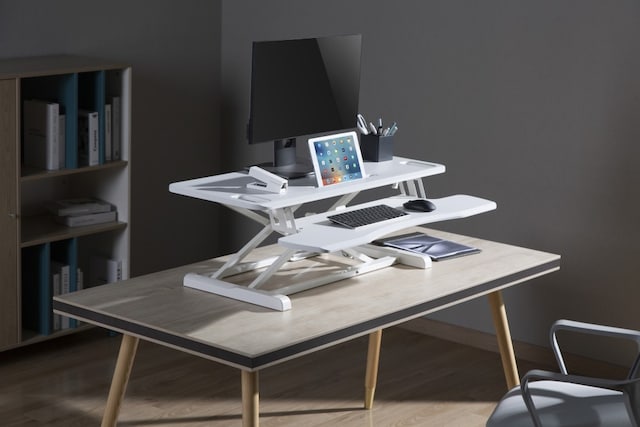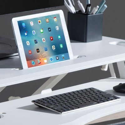 Vill du öka din produktivitet på jobbet? Detta ergonomiska skrivbordsstativ kommer med ett stativ för din surfplatta eller telefon, vilket gör det enkelt att vrida dem antingen horisontellt eller vertikalt, så att du enkelt kan multitaska!