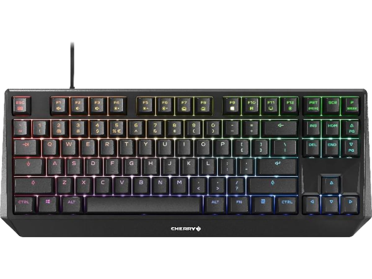 CHERRY MX BOARD 1.0 TKL - för mer plats på ditt skrivbord. Det kompakta högpresterande tangentbordet i beprövad MX-kvalitet och många belysningsalternativ (beroende på modell) garanterar spelupplevelse. Med laseretsade nyckelhattar och extra robusta, halkfria monteringsfötter för anpassad höjdjustering i 3 steg.