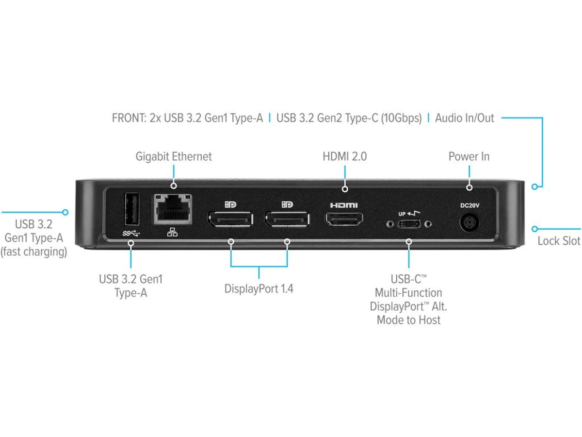 Njut av skarp, tydlig native-video och stöd för anslutning av upp till två skärmar. Med två DisplayPort 1.4-portar och en HDMI 2.0-port finns stöd för två skärmar (2560x1440 p60) eller en bildskärm (3840x2160 p60) och även olika lägre upplösningar. Du kan dessutom ansluta alla dina favorittillbehör med en kombination av USB-A (4 USB 3.2 gen1-portar, en med snabbladdning) och USB-C (1x 3.2 gen 2), plus ethernet- och ljudportar.