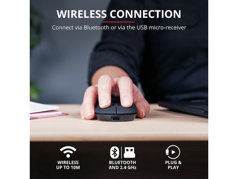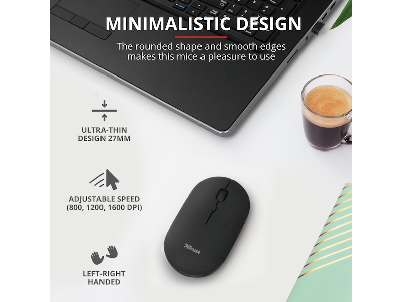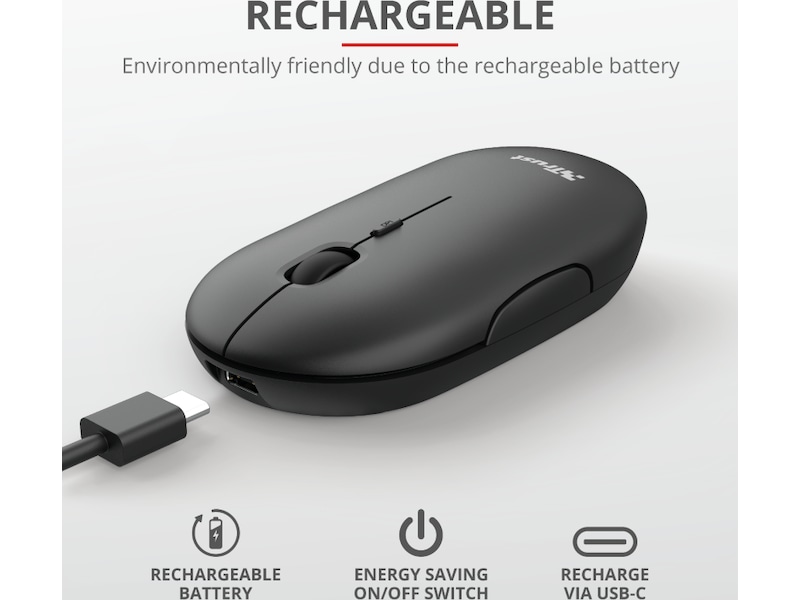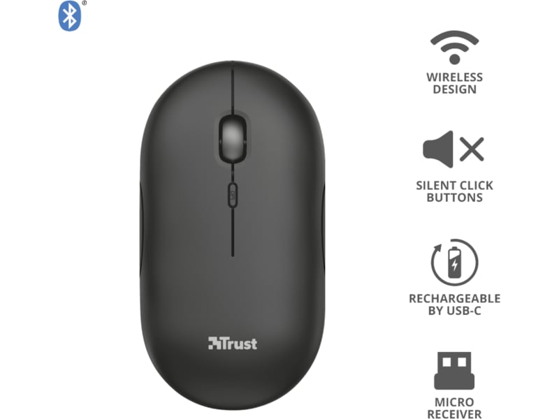 Trust Puck är utformad för att vara den bästa lösningen för dina utmaningar på språng. Denna ultratunna, trådlösa mus är liten nog att ta med sig, samtidigt som den är tillräckligt bekväm att använda. Den är full av praktiska funktioner, som dubbla trådlösa anslutningar, tysta knappar och ett uppladdningsbart batteri. Och den fungerar också för både vänster- och högerhänta användare!