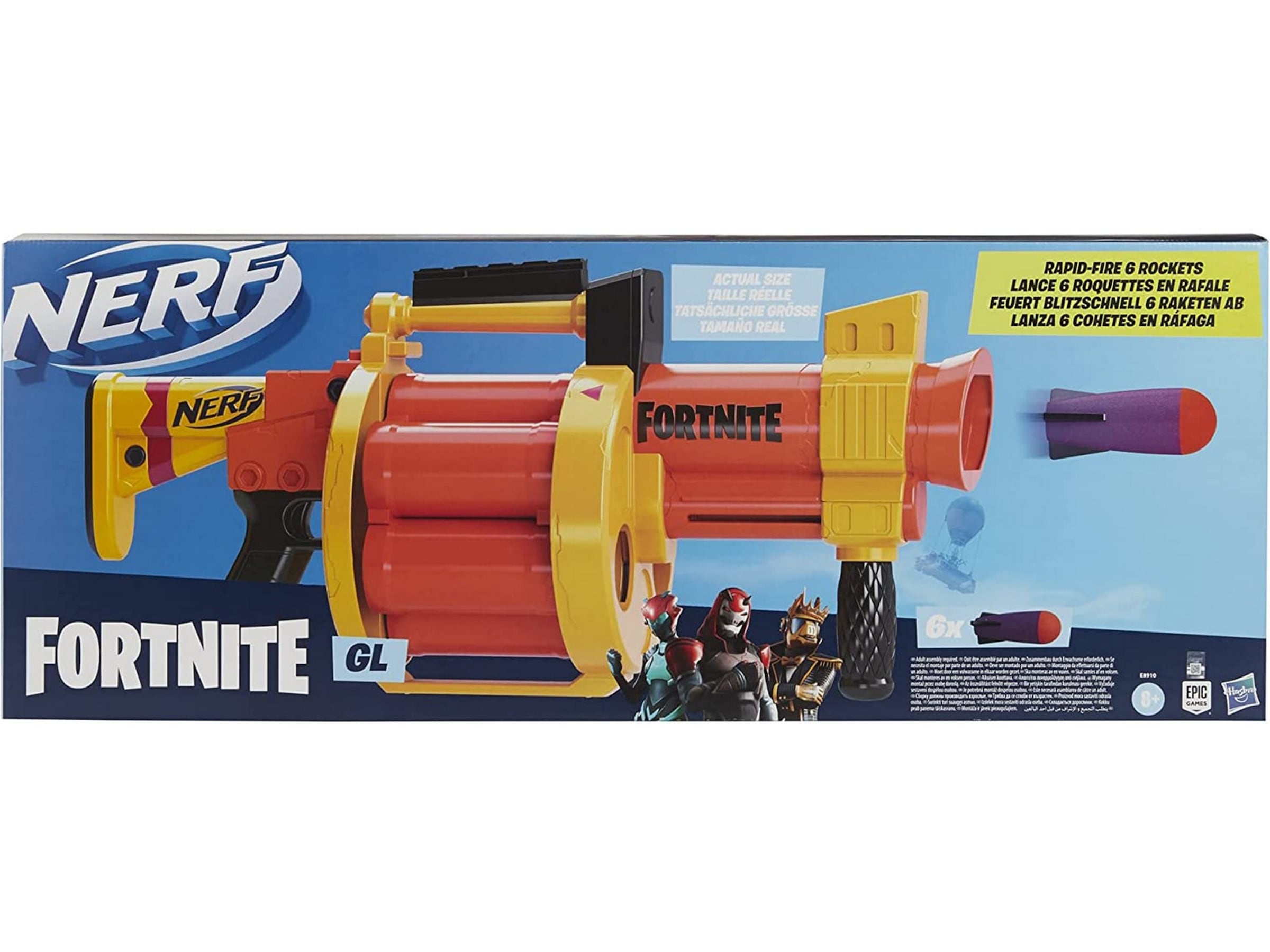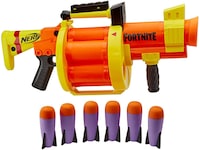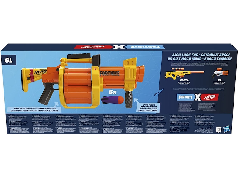 GL-blastern skjuter iväg stora Nerf-raketer i skum för episka strider! Den har en roterande trumma för 6 raketer och skjuter iväg 1 i taget när du pumpar skaftet manuellt. Tryck skaftet så långt framåt du kan, så roterar trumman och en raket placeras i avfyrningsposition. Dra skaftet så långt bakåt du kan, så skjuter du iväg en raket mot målet. Om du vill skjuta iväg en raket till för du skaftet framåt och tillbaka igen. 6 officiella Nerf-raketer medföljer, så att du kan fylla trumman. Ta dig an motståndarna med den mäktiga kraften hos Nerf Fortnite GL-blastern! Skyddsglasögon rekommenderas (medföljer inte). Copyright Epic Games. Hasbro och alla relaterade namn är varumärken som tillhör Hasbro.