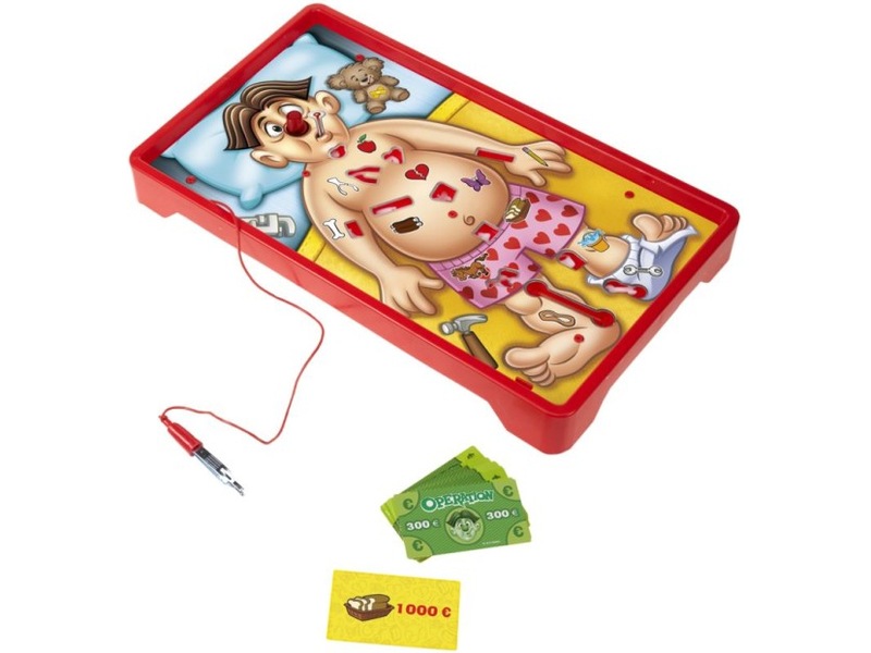 Dra ett kort och utför operationen genom att ta bort det som plågar patienten. Du får pengar när du undviker att utlösa summern! Spelaren med mest pengar har vunnit!