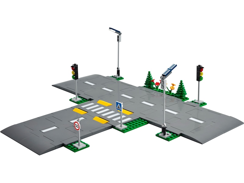 - Vad finns i lådan? Barn får 5 LEGO® vägplattor med trafikmarkeringar, farthinder och ett övergångsställe, plus gatlyktor som lyser i mörkret, leksakstrafikljus, vägskyltar, träd och grönska.