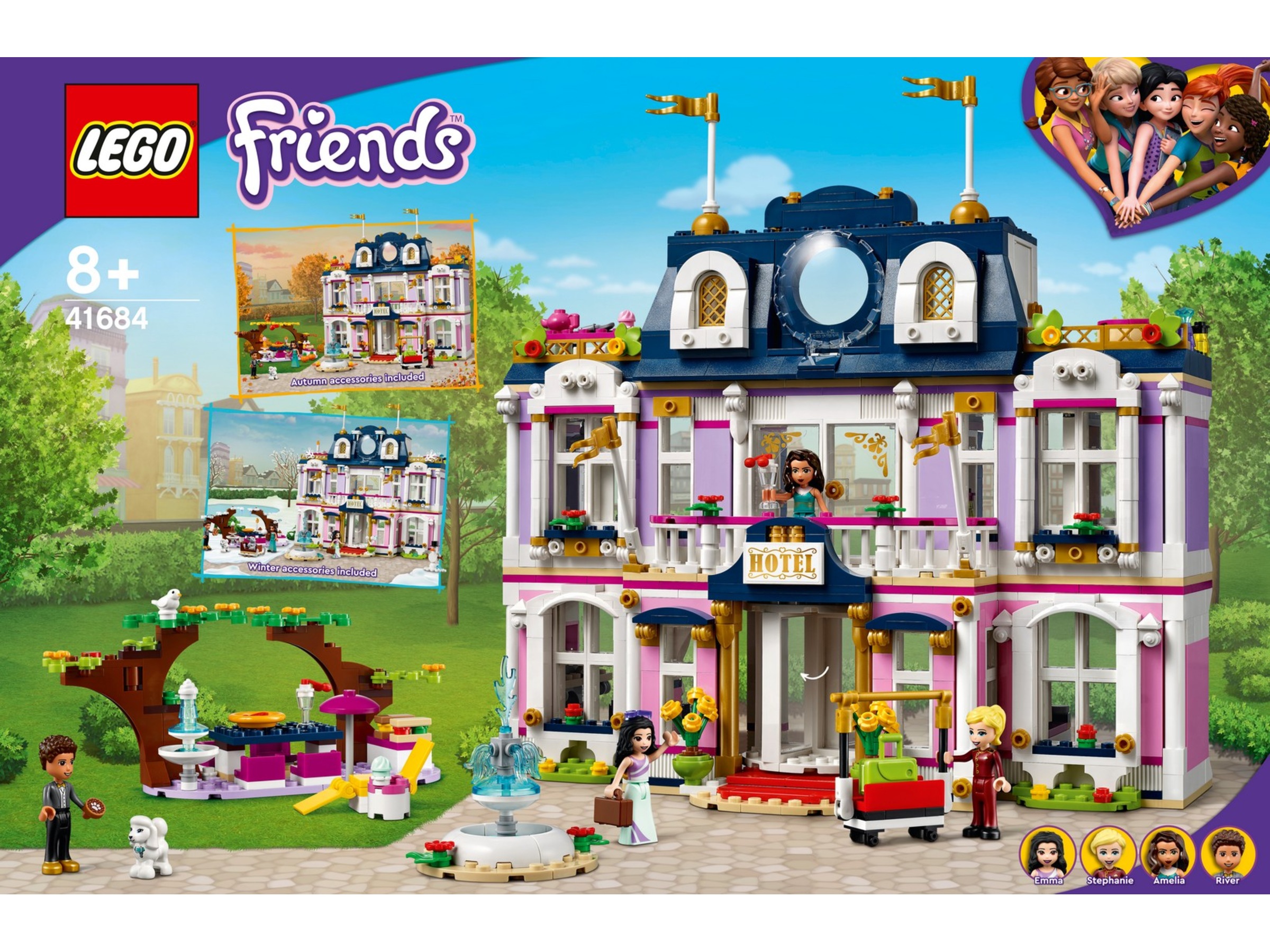 Detta vackra 3-våningsset är fullt av kreativa detaljer som kommer att underhålla små byggare i timmar med verklighetstrogen lek.Femstjärniga funktionerDet finns massor att utforska, från pianobaren och receptionen till sviterna och matplatsen utomhus, plus femstjärniga inslag som ett spa och en takvåning. Setet innehåller också en minidocka i form av skådespelaren Amelia så att barn kan låtsas leva kändisliv. LEGO® Friends Stephanie, Emma och River ingår också och kan vara gäster, receptionist eller piccolo.Set för alla årstiderInnehåller årstidstillbehör som ger en extra dimension till lekarna. När årstiderna växlar kan barn dekorera sin modell med kreativa detaljer och få lekarna att kännas nya varje gång. Trädens löv kan ändra färg på hösten, det finns snöbollar, istappar och en snögubbe till vintern, plus blommor till sommaren.