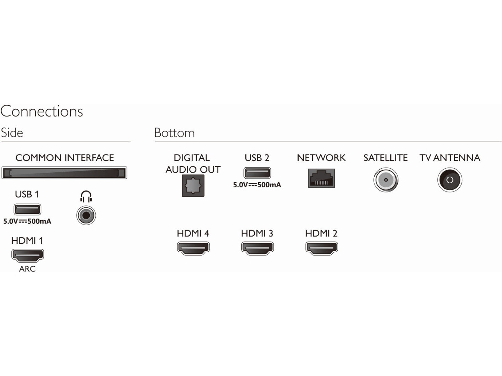 | Anslutningstyp | USB - sida, HDMI - sida, 3 x HDMI - nedre del, USB - nedre del, Hörlurar - sida, LAN - nedre del, Digital ljudutgång (optisk) - nedre del |