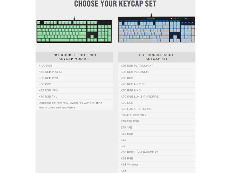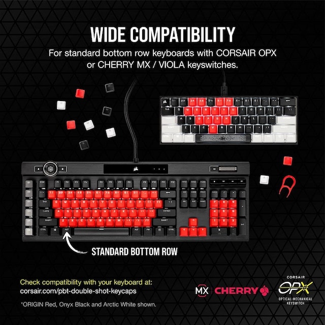 - Ett tangentset i full storlek och en standard nedre raden layout garanterar kompatibilitet med alla CORSAIR mekaniska och optisk-mekaniska tangentbord med en standard bottenrad och alla andra CHERRY MX-kompatibla tangentbord.*
