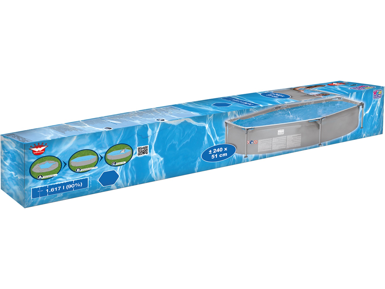 Denna 240 x 51 cm pool garanterar ett stort nöje för hela familjen och ger förfriskningar och gott humör. Vattenhalten vid en deponi på 90 procent är ca. 1 617 liter, monteringstid endast ca. 30 minuter. För optimal användning rekommenderar vi användning av filterinstallation (ingår ej).