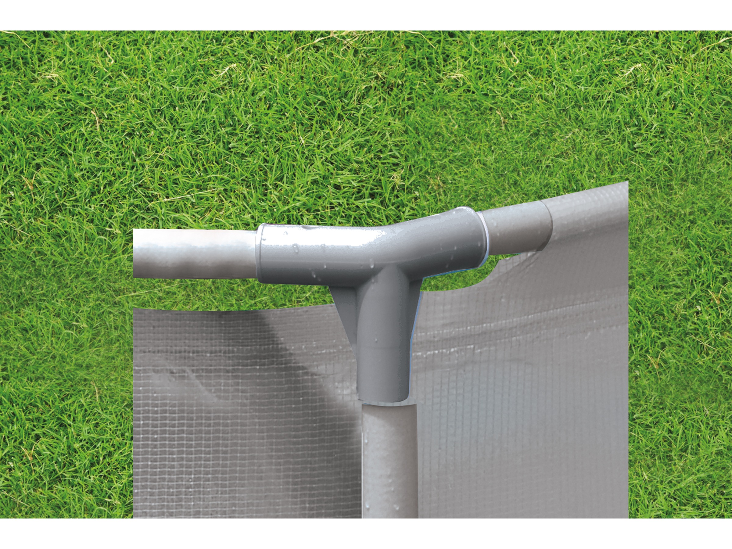 Skyddet av mycket slitstarkt PVC-tyg är klorbeständigt och har en dräneringsventil för enkel dränering av vattnet - för att tömma vattnet ansluter du helt enkelt en vanlig trädgårdsslang till sidoventilen.