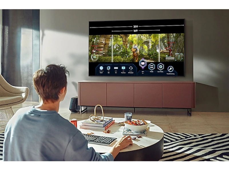 Bildförhållandet 21:9 och 32:9 ger dig den extra skärmbredd du behöver för att få maximal spelupplevelse och besegra dina motståndare. Optimera spelupplevelsen med Game Bar, en skärmmeny där du kan justera bildförhållandet, styra ingångsfördröjning, FPS, HDR och trådlösa headsetinställningar etc. i realtid.