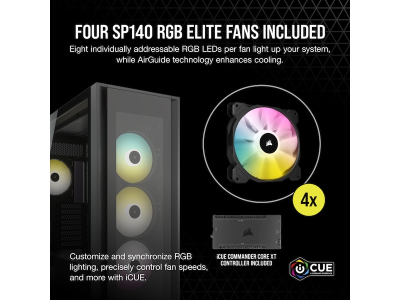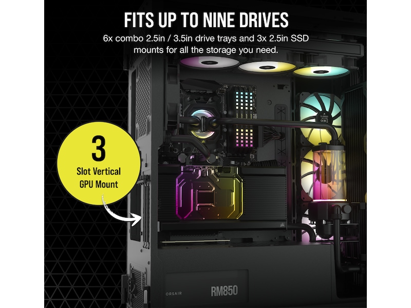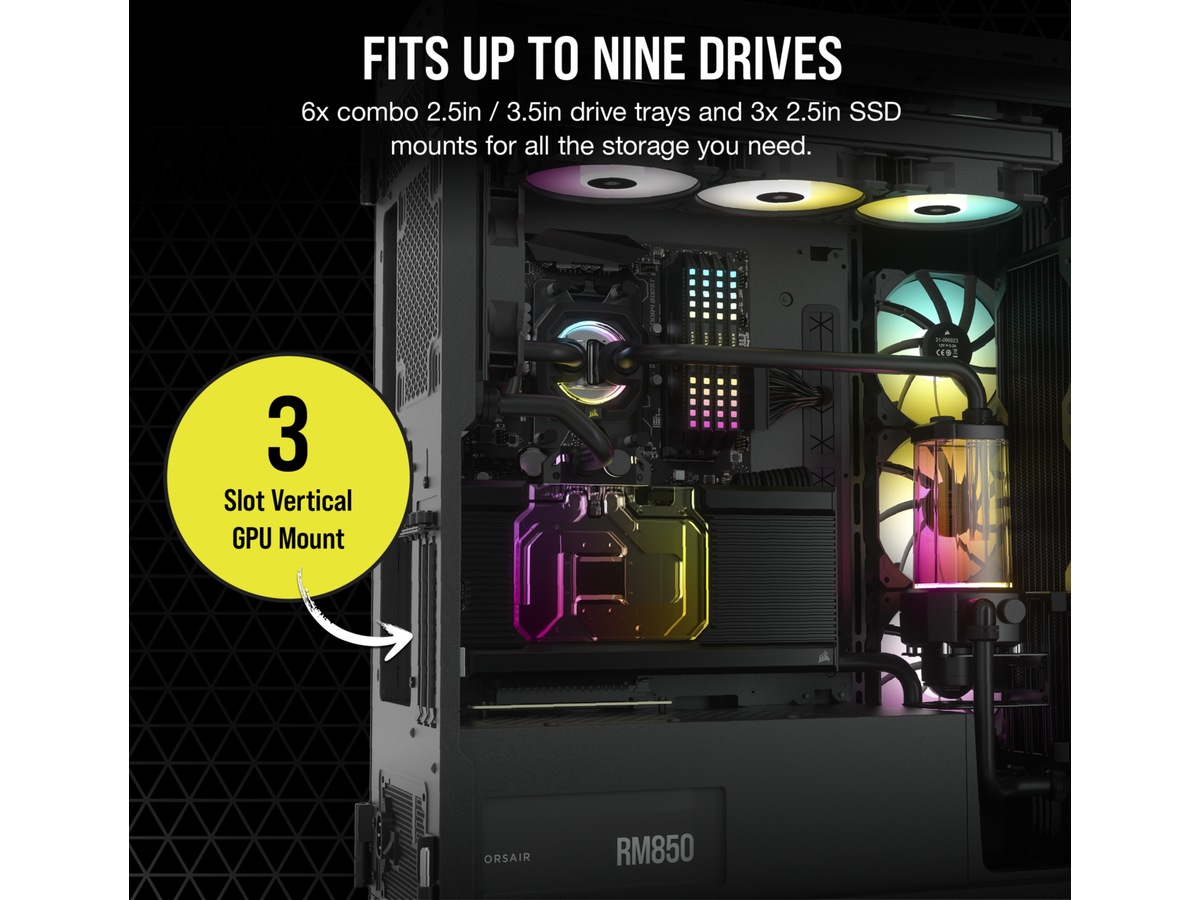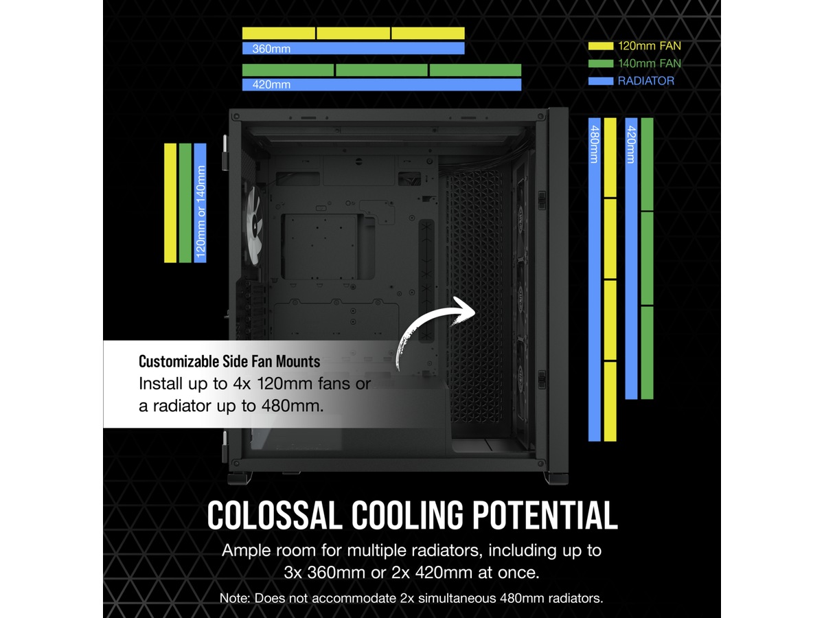 Egenskaper hos systemkabinett Plats för 360/420 mm element i övre panelen, Kabelhanteringssystem, RGB-belysningssystem, Stöd för 120/140 mm element bak, Nedre dammfilter, Stöder 420/480 mm radiator i frontpanel, Plats för 420/480 mm element på höger sida, Dammfilter till sidopanel, Verktygslösa sidopaneler (push-to-lock), RGB-fläktar, Dammfilter till överdel, Främre dammfilter, Främre panel i tempererat glas