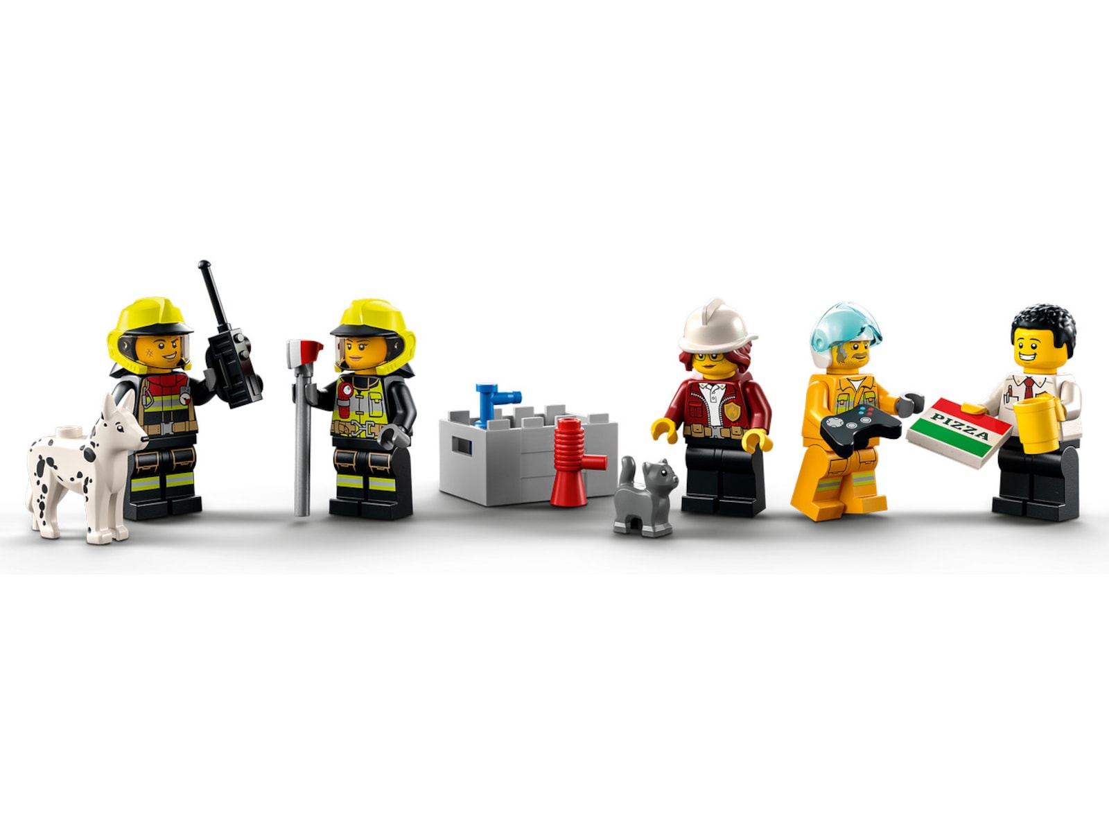 - Med LEGO® minifigurtillbehör – Innehåller 4 hjälmar och walkie-talkie, brandyxa, mugg, pizzakartong och brandsläckardelar