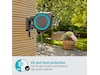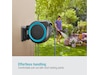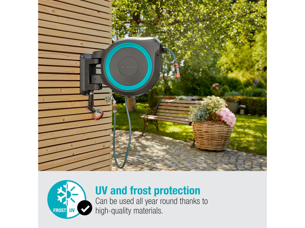 Tack vare det praktiska väggfästet kan slanglådan vridas i en vinkel på 180°. Detta gör att du kan vattna varje hörn av din trädgård flexibelt och utan att böja slangen. Efter användning kan den kompakta lådan skjutas åt sidan på väggen för att spara utrymme.