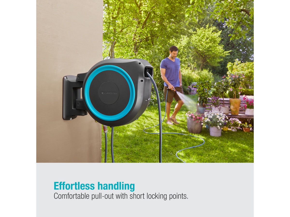 Det praktiska väggfästet gör att slangvindan kan roteras 180° för att följa dina rörelser i trädgården. Detta gör det enkelt att vattna i trädgården, med maximal rörelsefrihet och en slang som inte trasslar.