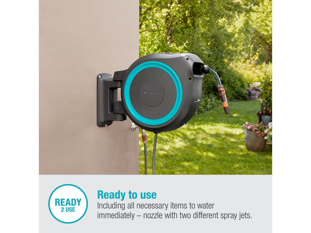 Slanglåda levereras med alla delar du behöver:: ett väggfäste, en anslutningsslang, alla nödvändiga original GARDENA system och monteringsdelar samt ett munstycke som låter dig välja mellan två olika strålar.