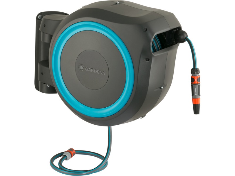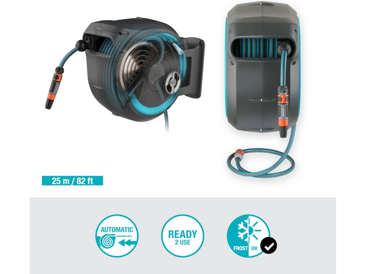 Den högkvalitativa stålfjädern inuti lådan rullar upp slangen automatiskt, tillförlitligt och jämnt. Innovativ RollControl-teknik ger säker och kontrollerad indragning.