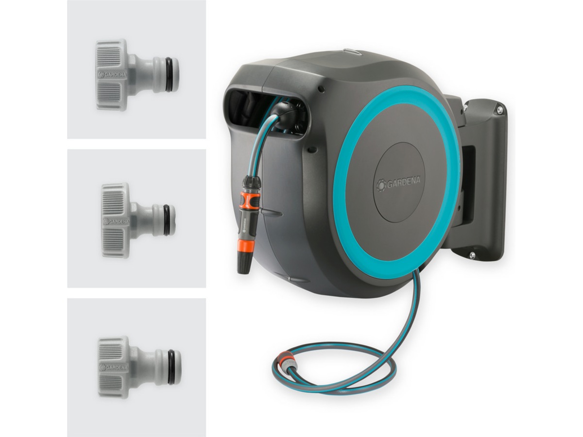 - Sats med kopplingar 1x Väggmonterad slanglåda RollUp M/L, 1x Väggfäste inkl. Skruvar, 1x 1,5 m anslutningsslang, 3x krankoppling, 1x slangkoppling, 1x vattenstopp, 1x rengöringsmunstycke