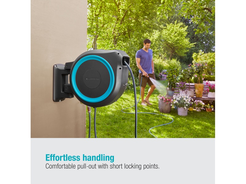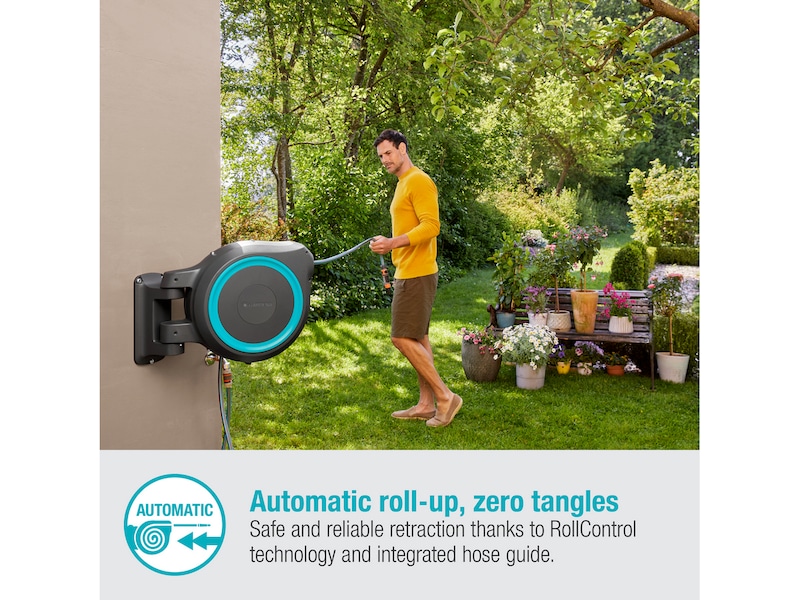 Med ett lätt drag i änden av slangen aktiveras den integrerade stålfjädern och lindar tillbaka slangen automatiskt och tillförlitligt. RollControl-tekniken säkerställer långsam och säker indragning, oavsett hur långt slangen rullas ut.