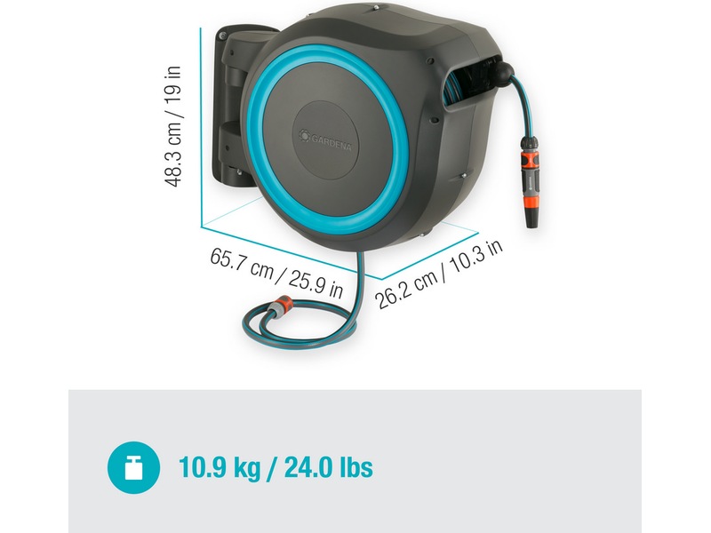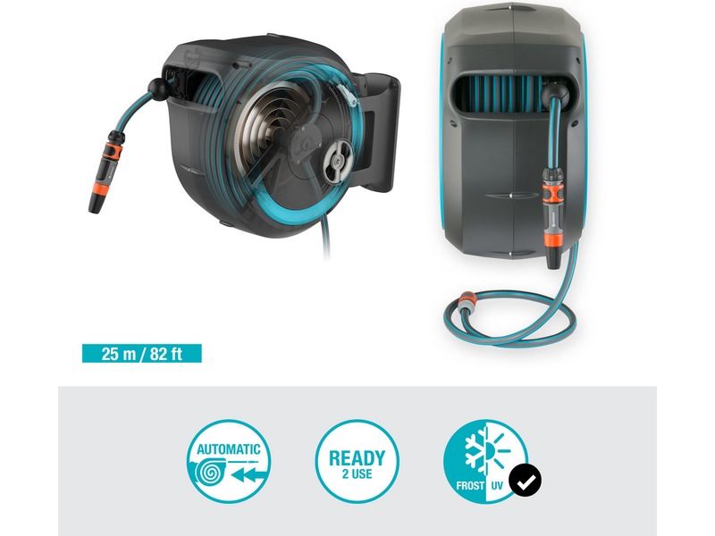 Den väggmonterade RollUp XL-slanglådan levereras med ett väggfäste, en 25 meter vattenslang, en anslutningsslang, alla nödvändiga GARDENA-systemdelar och ett munstycke med två olika spraystrålar.