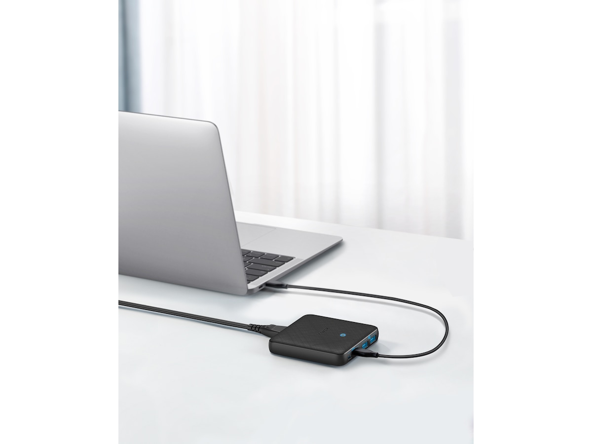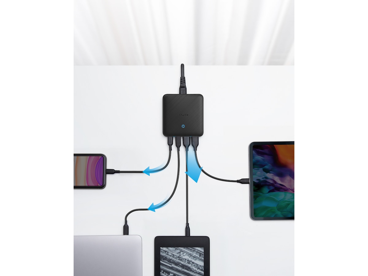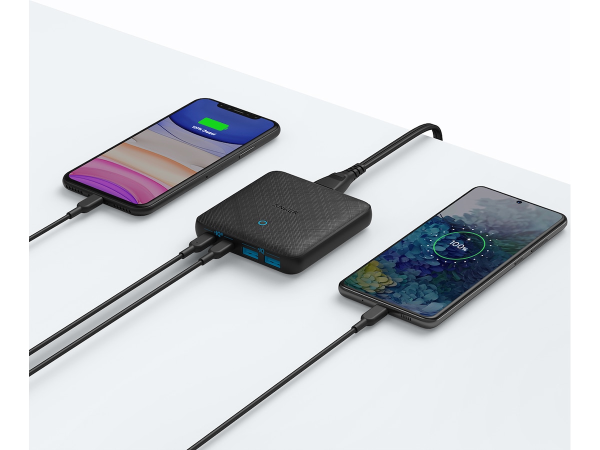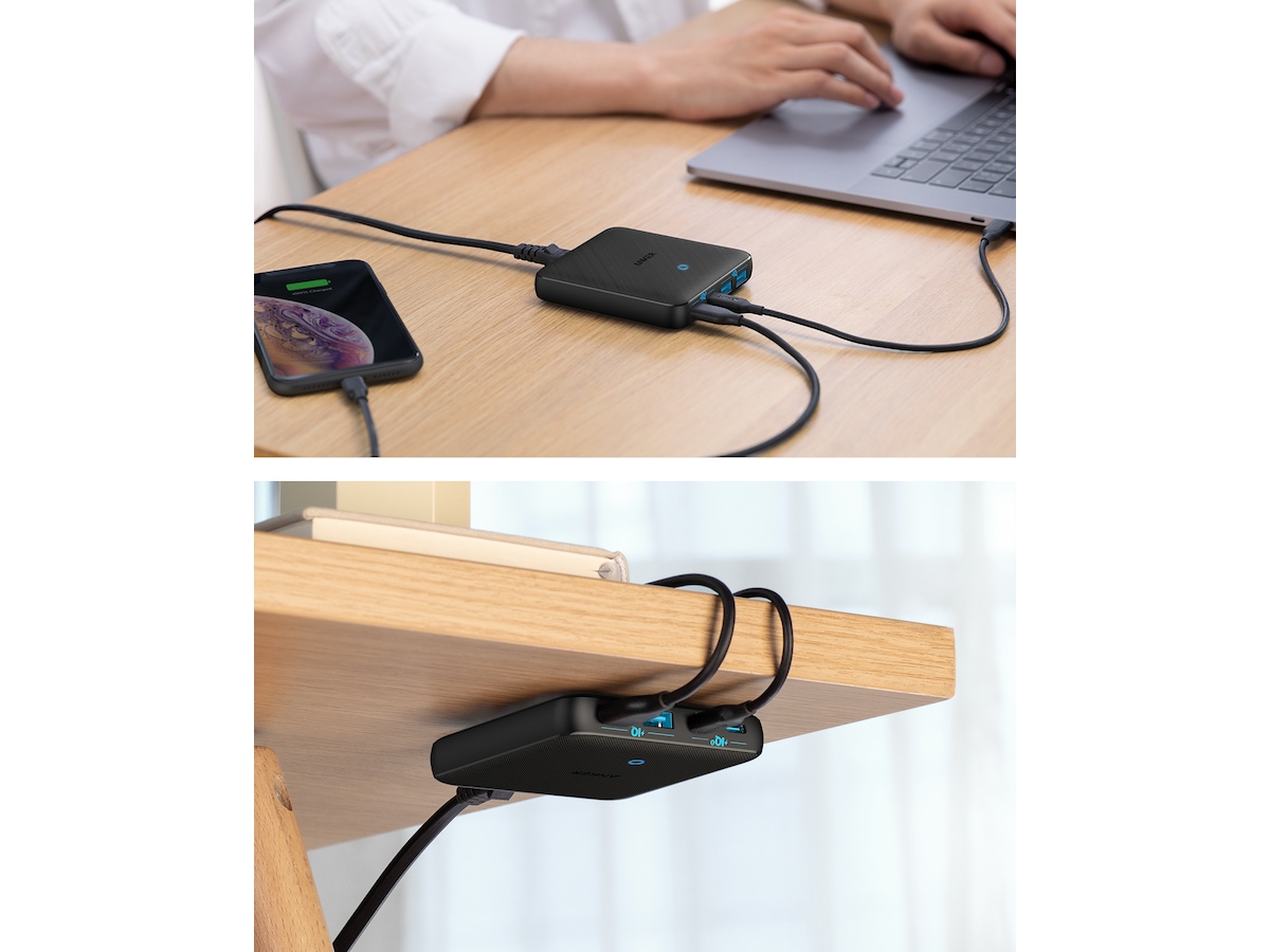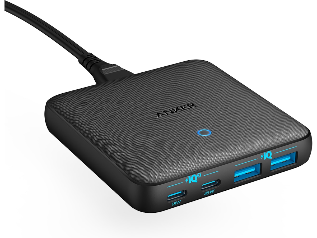 En PowerIQ 3.0-aktiverad USB-C-port pumpar ut en maxeffekt på 45W för att ladda praktiskt taget vilken USB-C-enhet som helst med högsta hastighet, medan 3 USB-portar delar på totalt 20W för att ge optimerad laddning för mobila enheter.