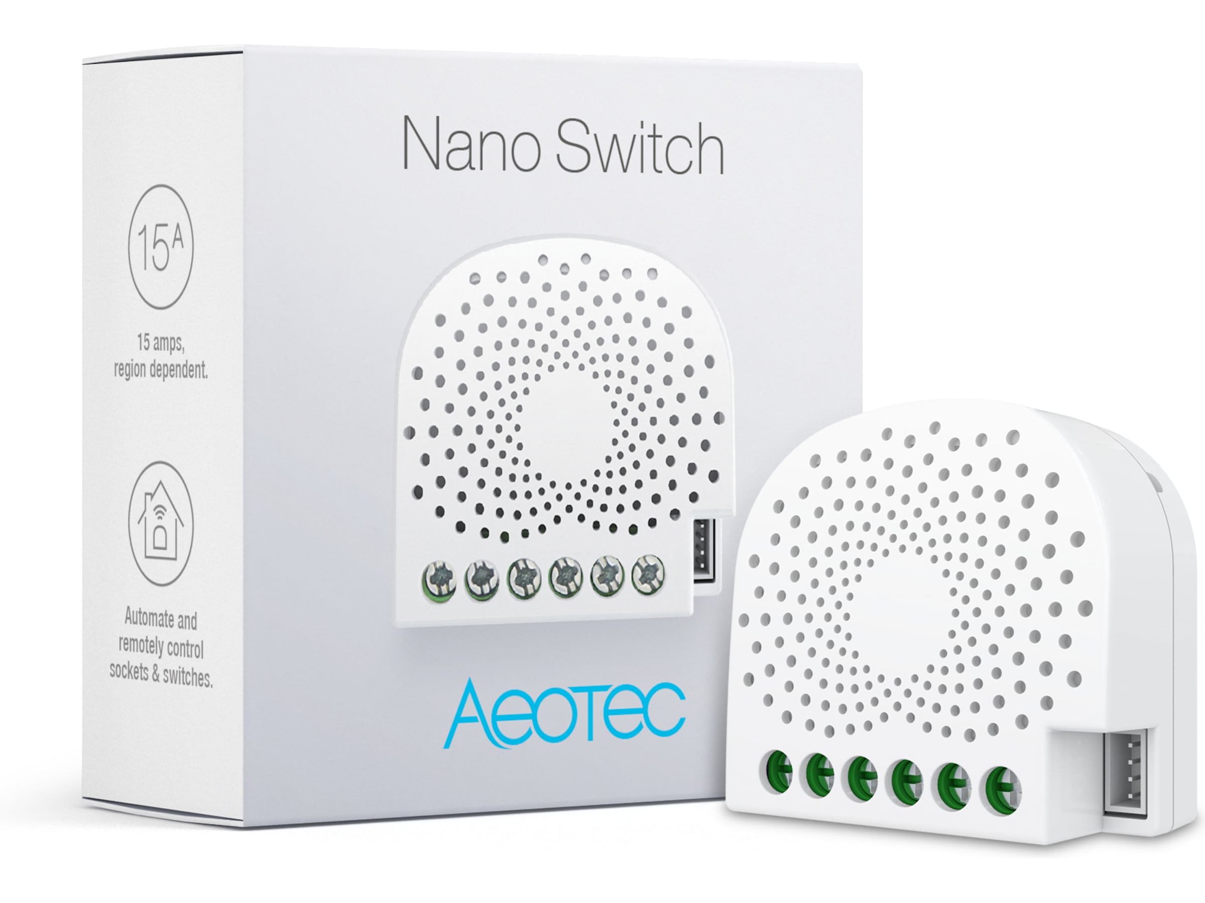 Den driver automatisering och schemaläggning, och den övervakar även energiövervakning. Nano Switch kommer i en utgåva med Aeotecs superexakta energimätningsteknik som registrerar elanvändning med 99 % noggrannhet.