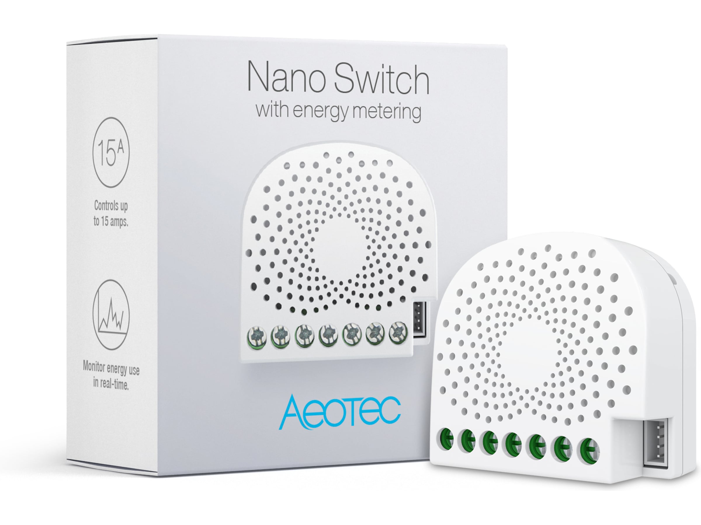 Den driver automatisering och schemaläggning, och den övervakar även energiövervakning. Nano Switch kommer i en utgåva med Aeotecs superexakta energimätningsteknik som registrerar elanvändning med 99 % noggrannhet.