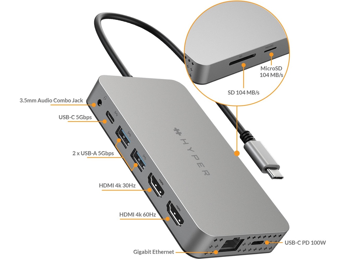 Förvandla sömlöst din M1/M2 MacBook till en kraftfull arbetsyta med 4K 60Hz och 4K 30Hz HDMI-videoportar, en USB-C 100W Power Delivery-port, MicroSD/SD-kortplatser, två USB-A 5Gbps-portar, ett 3,5 mm ljuduttag för hörlurar , och mer.