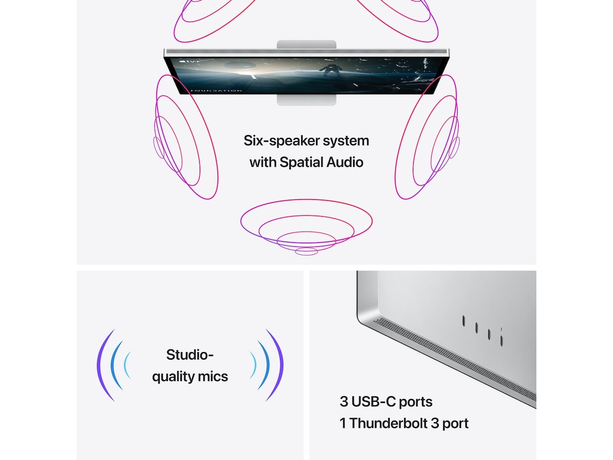 Detta är Studio Display. En avancerad 27-tums 5K Retina-skärm * med en 12 MP-kamera med I fokus, mikrofoner av studiokvalitet och sex högtalare. Kompatibel med alla Mac-datorer.