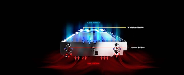 Vägleder luftflödet så att det går jämnare och snabbare för att förbättra kylningseffektiviteten med hjälp av de V-formade skärande lamellerna och de V-formade luftventilerna.
