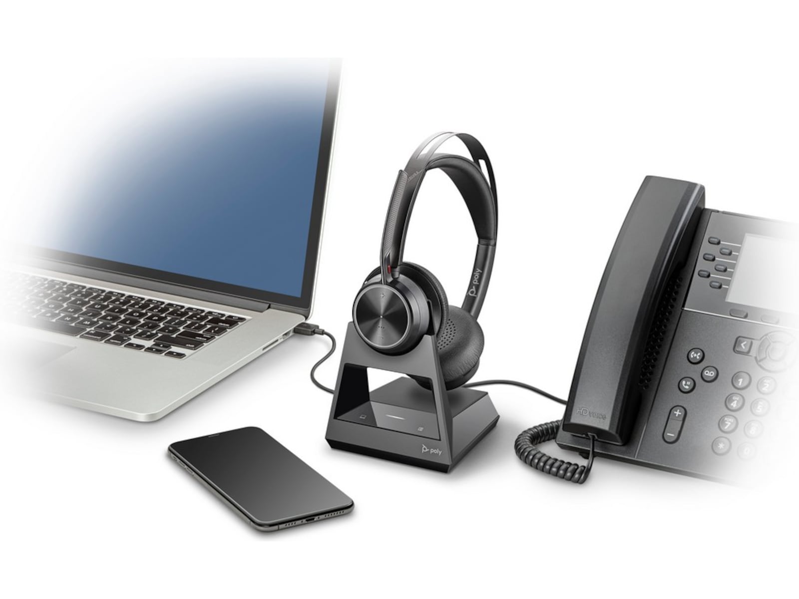 - Bordsstativ (UC-version) eller kontorsbas (Office-version) för enkel laddning