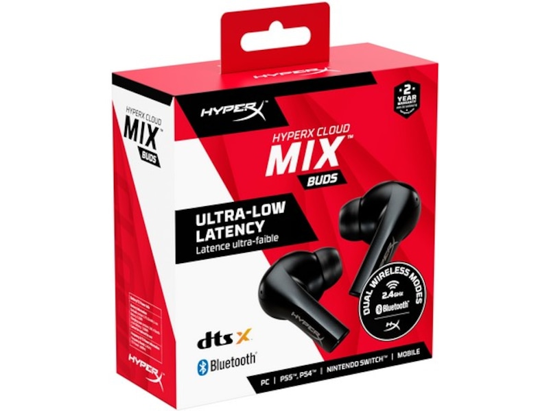 HyperX Cloud MIX Buds är äkta trådlösa hörlurar designade för spel och har en anslutning på 2,4 GHz med låg latens. De dubbla trådlösa Cloud MIX Buds är lätta och bekväma och har en trådlös USB Type-C-adapter för spel med ultralåg latens och en bekväm Bluetooth®-anslutning för att lyssna på musik eller svara på telefonsamtal när du är på språng. Den medföljande USB-C till USB-C passthrough-förlängaren låter dig föra adaptern närmare dig för förbättrad trådlös prestanda under stationär PC-gaming.