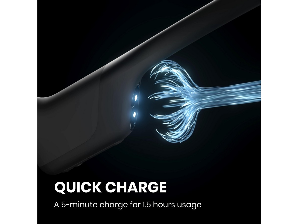 OpenRun Pro-funktionen Quick Charge. Känner du för en kort löptur? En 5-minuters snabbladdning ger dig 1,5 timmars lyssningstid så att du snabbt kan komma igång.