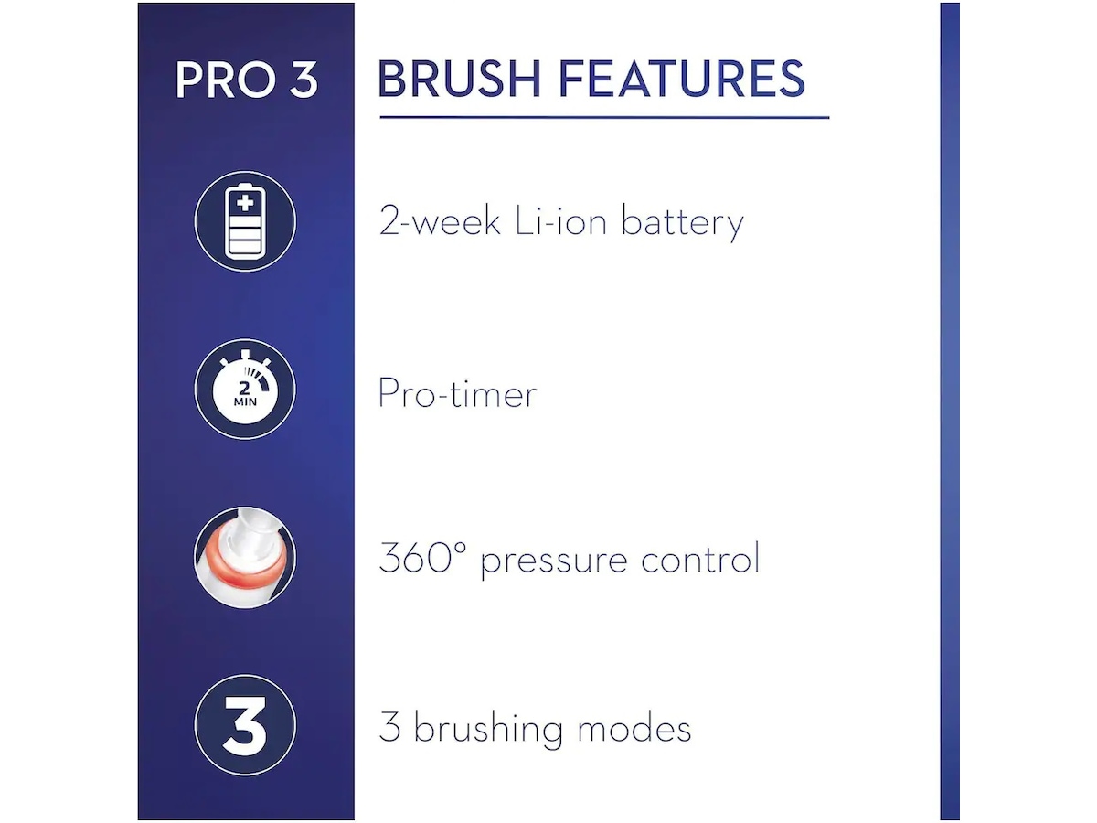 Dessutom hjälper tandborsten till att skydda det känsliga tandköttet med hjälp av Oral-B:s patenterade tryckkontrollteknik, som minskar borstningshastigheten och uppmanar dig att borsta försiktigare om du borstar för hårt.