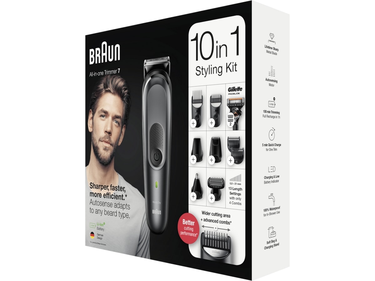 - 10-i-1: Brauns MGK7 skäggtrimmerkit för män trimmar alla hårlängder. Från skägg, ansikte och öra till nästrimning, kroppstrimning och manscaping