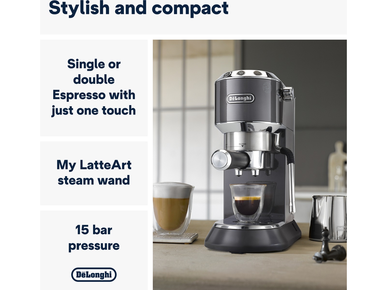 - Hög prestanda i smart storlek, endast 15 cm bred och utrustad med 15 bars tryckvärmesystem
