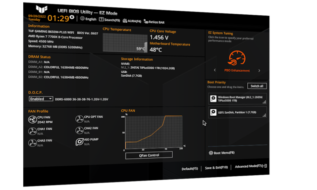 Omfattande minnesinställningsalternativ är hörnstenen i TUF GAMING-moderkort. Med TUF GAMING B650-moderkort kan du extrahera all potential ur dina DDR5-moduler, oavsett om de kommer från ett kit med extrem hastighet eller en nybörjaruppsättning som annars skulle vara låst.