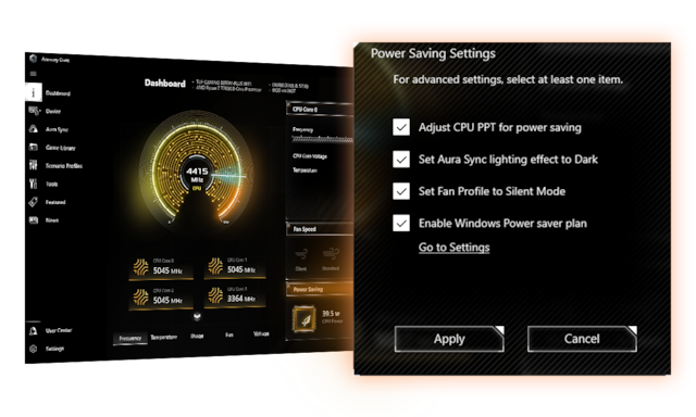 Funktionen för energisparande innehåller flera inställningar för att enkelt optimera strömförbrukningen och maximera energibesparingarna. Du kan aktivera en effektbegränsning för processorn, dimma Aura-belysningen och ställa in fläktprofilen till ett energisparläge. Du kan också växla den energisparplan som finns inbyggd i Microsoft Windows.