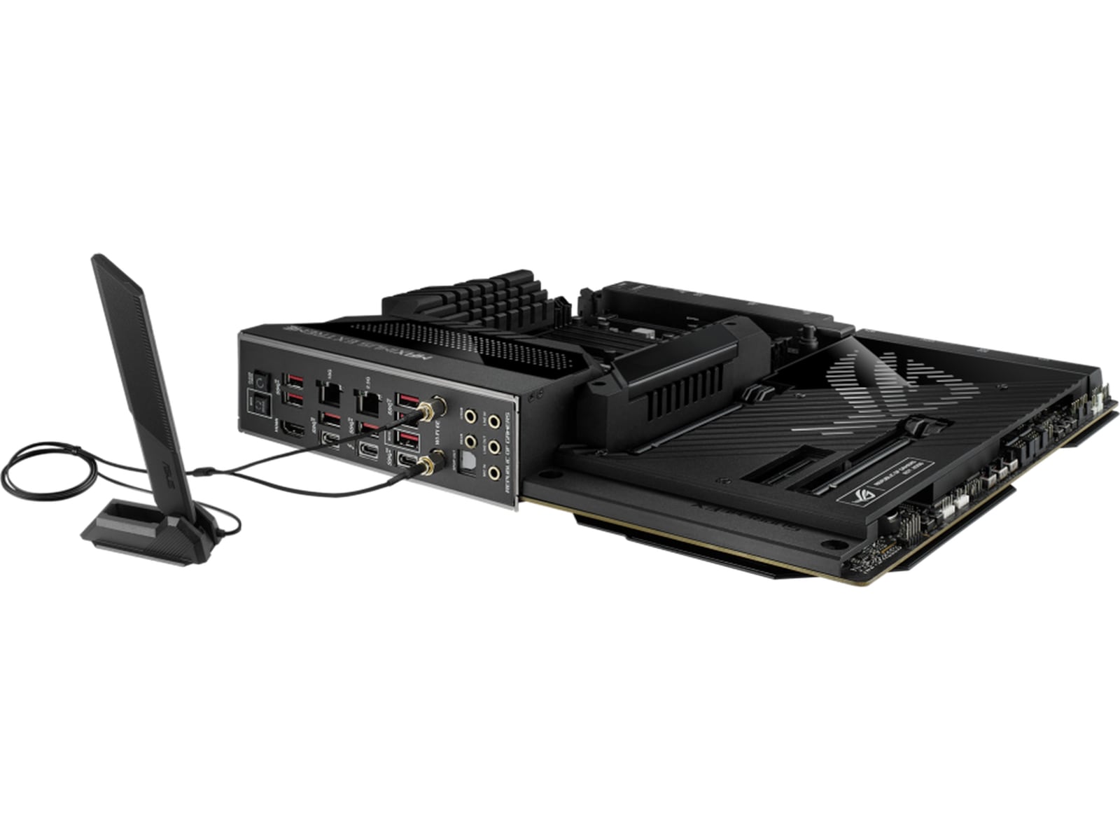 • ”Gör-det-själv”-vänlig design: ROG-vattenkylningszon, PCIe Slot Q-Release, M.2 Q-Latch, förmonterad I/O-plåt, Q-Code, Q-LED, FlexKey-knapp, Start-knapp, BIOS FlashBack™-knapp och Clear CMOS-knapp